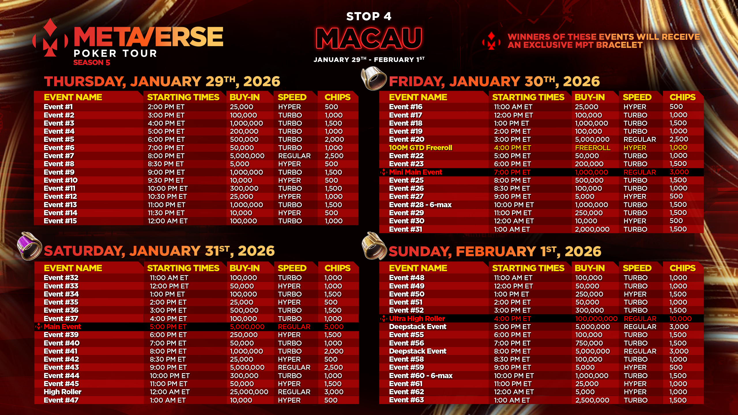 Get ready for nonstop action from January 29 to February 1, featuring 60+ tournaments packed into four big days! With buy-ins ranging from Freerolls to Ultra High Rollers, Stop 4 offers something for every player. Chase MPT Winner’s Rings, exclusive Bracelets, and valuable Season 5 leaderboard points as Macau 2050 lights up the Metaverse Poker Tour!