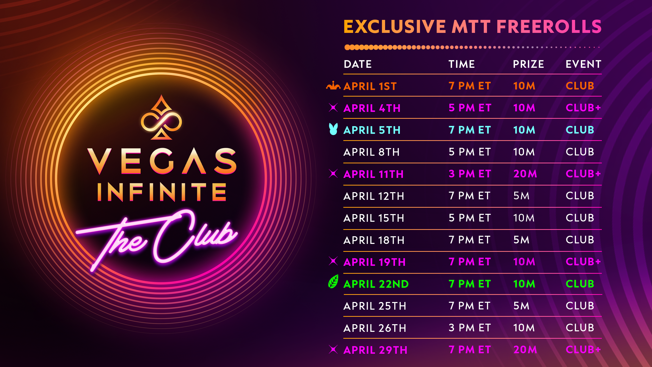 April is packed with exclusive MTT Freerolls running all month long, giving you more chances to build momentum and climb the leaderboard. Jump in for special event drops with additional freerolls across April Fools ' Day, Easter Day, and Earth Day, each bringing extra opportunities to stack wins and stay in the action. Lock in your seat. Chase the prize pool and make your run unforgettable!